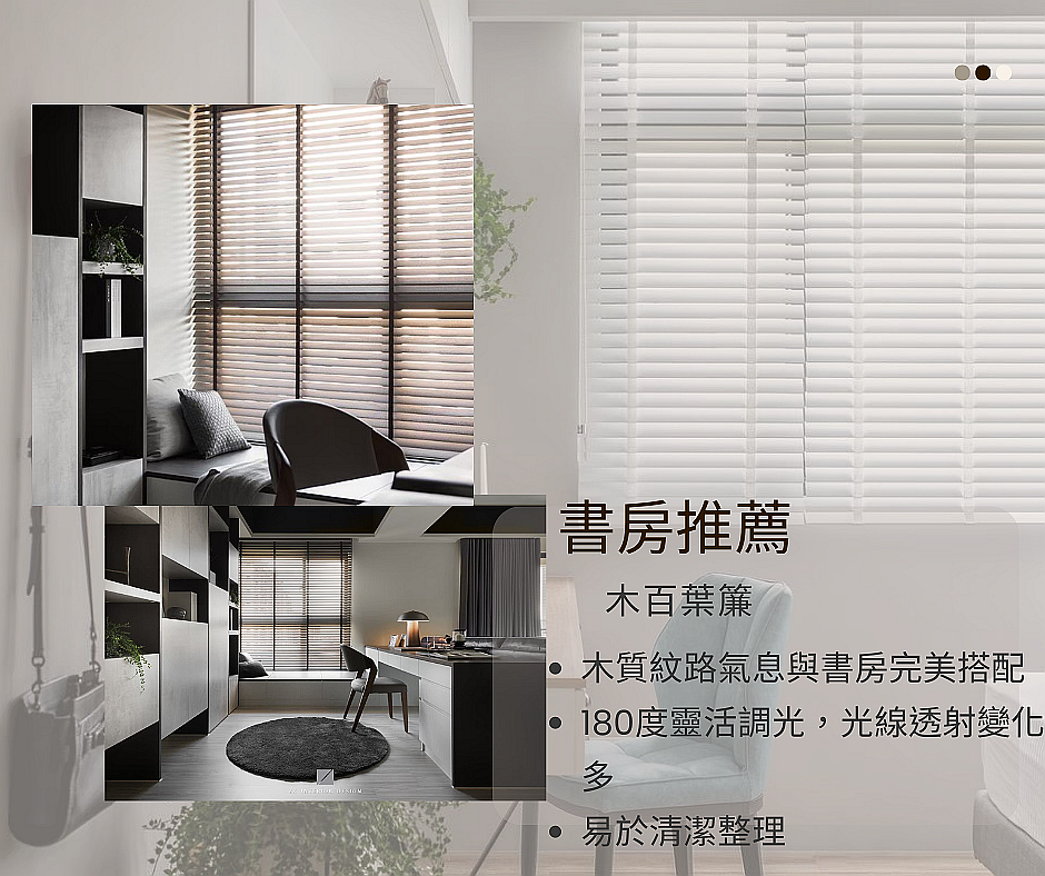 木百葉窗不僅通風性好,沉著的葉片重量,也不容易在開窗通風時隨風飄揚,能適應各種環境,不論是客廳、書房、陽台、浴室,都能見到它的身影!