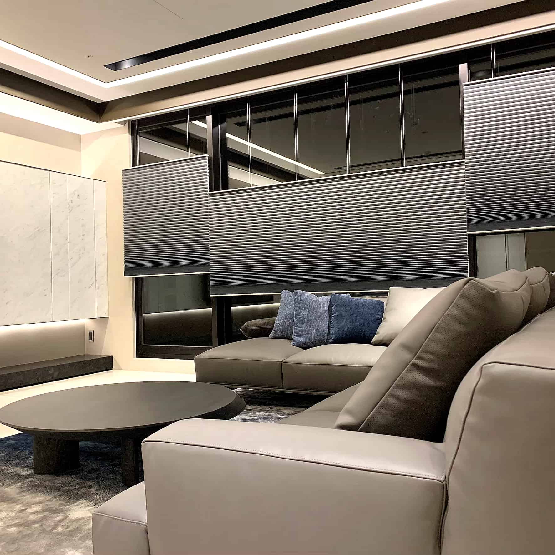 緊靠彼此的垂直簾片,底部沒有相接的鏈條和軌道,少了拉合時的惱人聲響,多了靜謐的優雅與流暢,在簾片穿梭之際也更增添一分安全性。