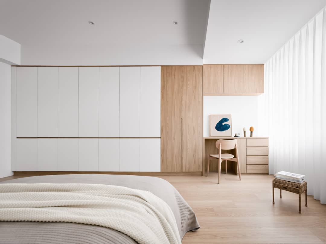 潔白的空間中,用木質方正的櫃體呈現出日式風格的簡約氣氛。